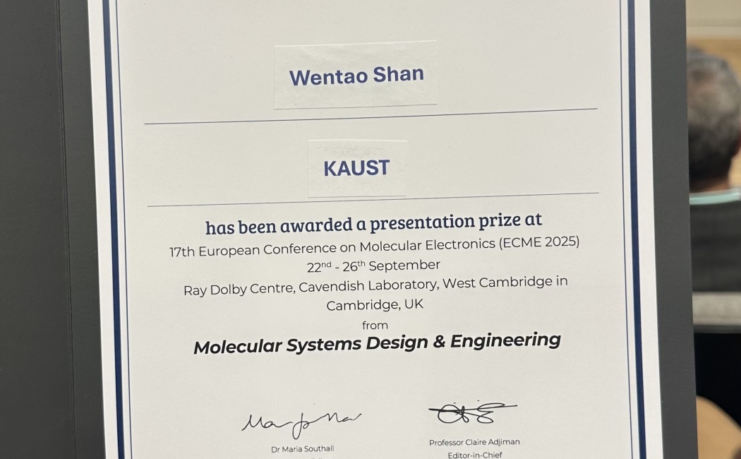 Congratulations to Wentao for receiving a poster prize in the poster presentation at the 17th European Conference on Molecular Electronics (ECME 2025)! He presented his cutting-edge research on Organic Electrochemical Synaptic Transistors.
